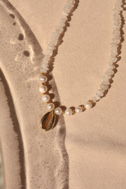 Collar piedra luna con perlas de río y conchita de chapa de oro